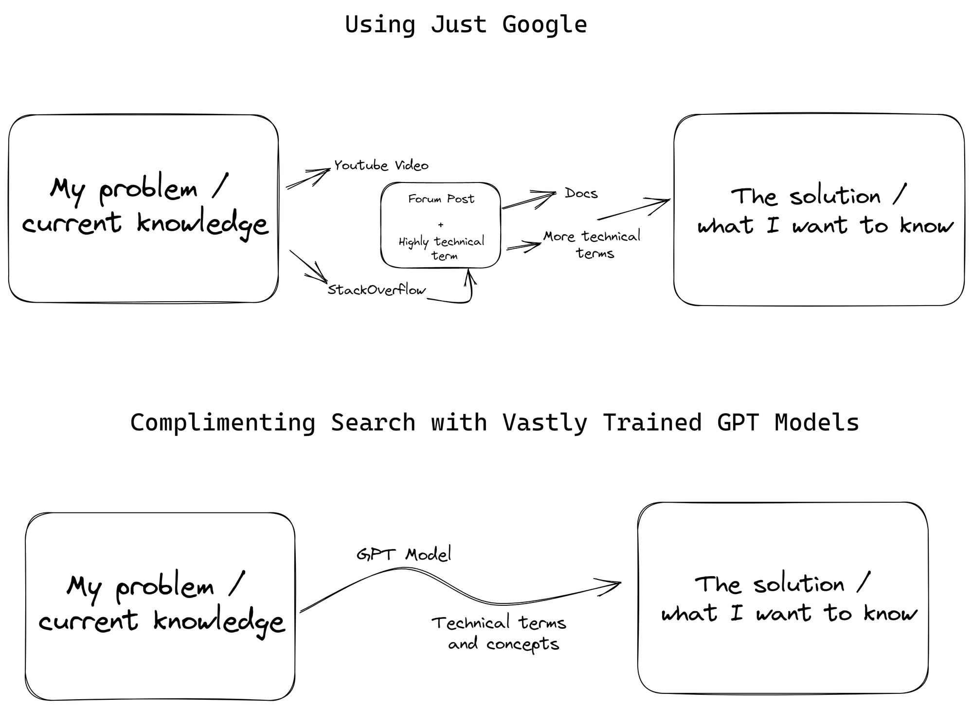 Search engines are a great starter for the internet. I don't think GPT models are going to "kill" search engines😆. You still need some synthetic ways to navigate the internet. However, search engines by themselves, have blatant limitations from the standpoint of knowledge communication. Namely, there are concepts or terms that are sometimes the tipping point for learning something new or solving a problem. Navigating the internet with a search engine means that you just happen to search the right terms to arrive at some set of knowledge that bridges your knowledge gaps, or someone else architects and builds enough bridges leading to that concept. These are the innovators of the world: the kind of people that simplify and market a solution or concept so well that it can be utilized and found by all sorts of "knowledge workers" (people using knowledge to solve problems).