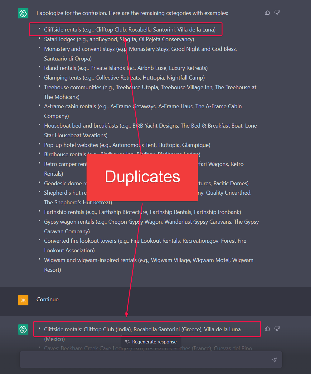 "Continue" and duplicated list items in ChatGPT