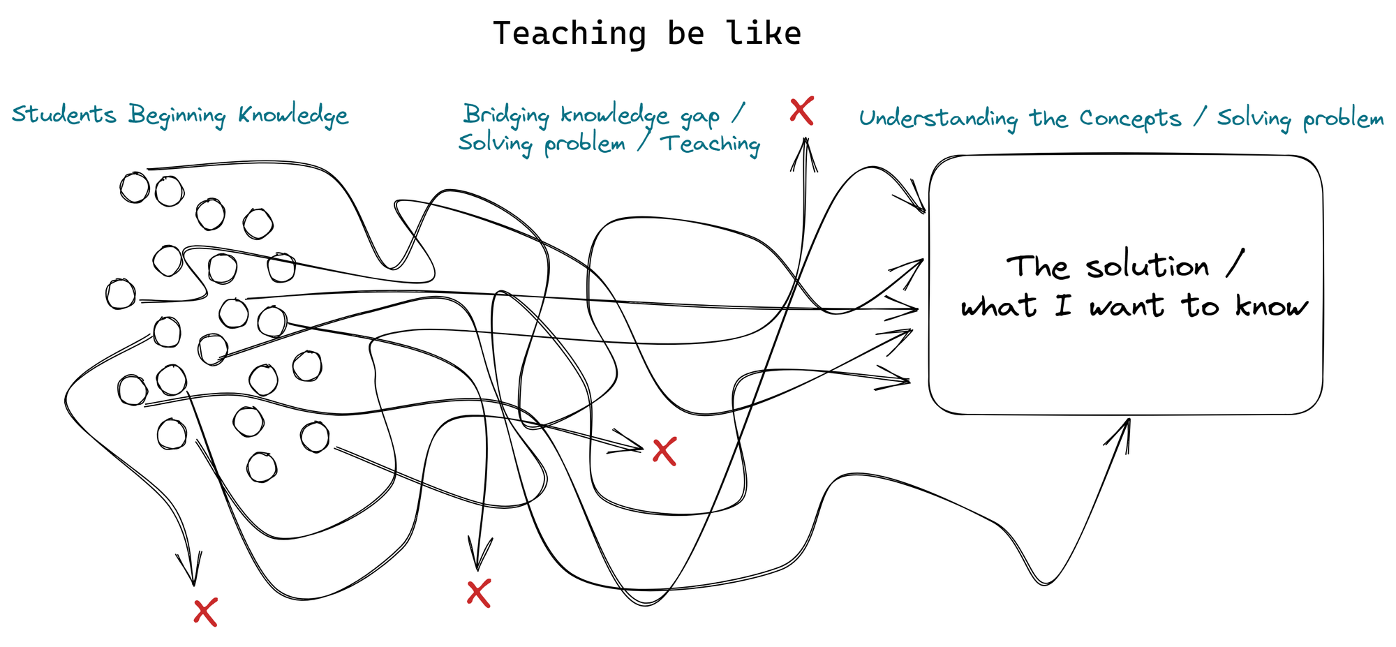 Teachers have the specific job of bridging knowledge gaps with students, and their jobs are even more difficult because they have to define a curriculum or teaching strategy that concludes with all students at the "what you want them to know" area. The problem is, that every student has distinctive knowledge configurations at the start. They all need slightly different bridges or routes to get to the "solution" area, and yet somehow the teacher has to create a bridge that will work for the majority or somehow build detours for various clumps of students. Not to mention, you have to constantly reevaluate students' abilities and knowledge configurations, and keep them remotely interested in doing the work to get to that point of understanding (@ my fiance - she's a teacher🤣).