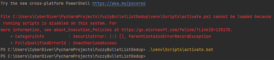 If I ever get the "activate.ps1" error, I just do the following in Pycharm: